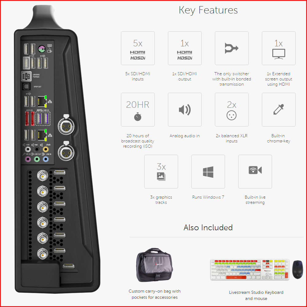 Livestream Studio One - Studio One is an easy-to-use, reliable, compact switcher and encoder (only 11 inches wide) with mighty processing power. Stream up to 4K resolution, from two 4K inputs or four HD inputs ( HDMI or SDI ).