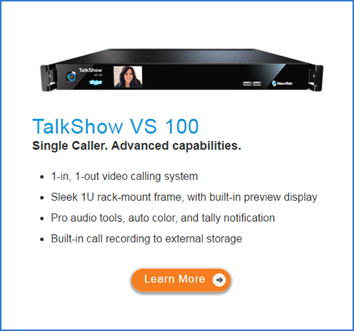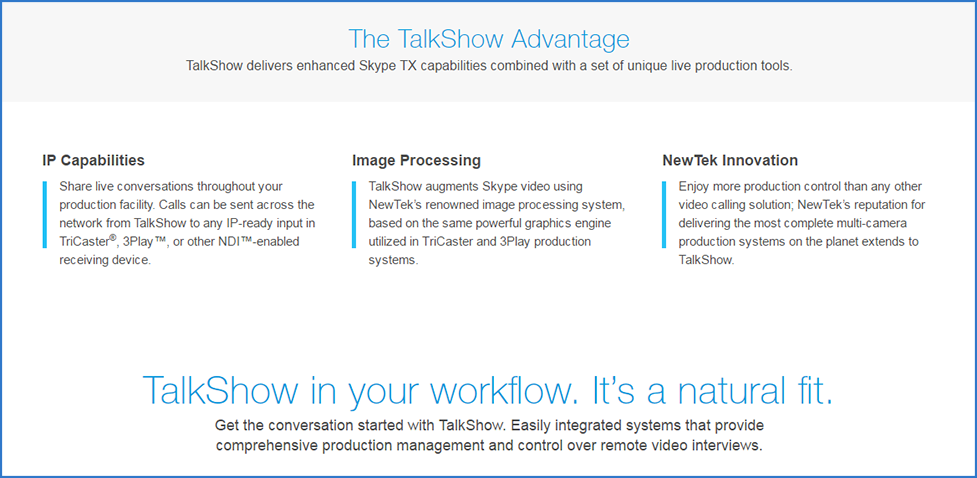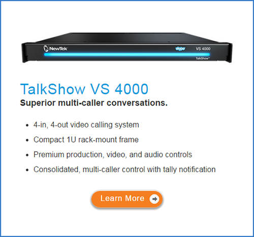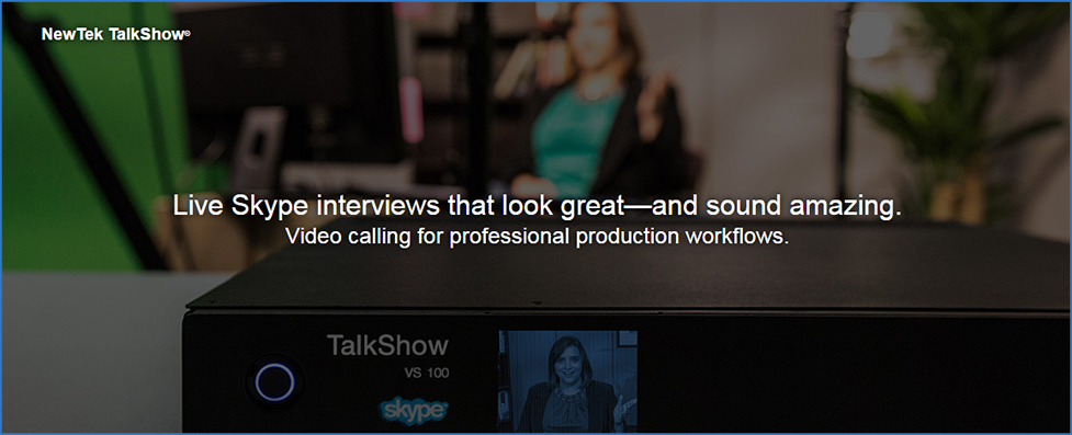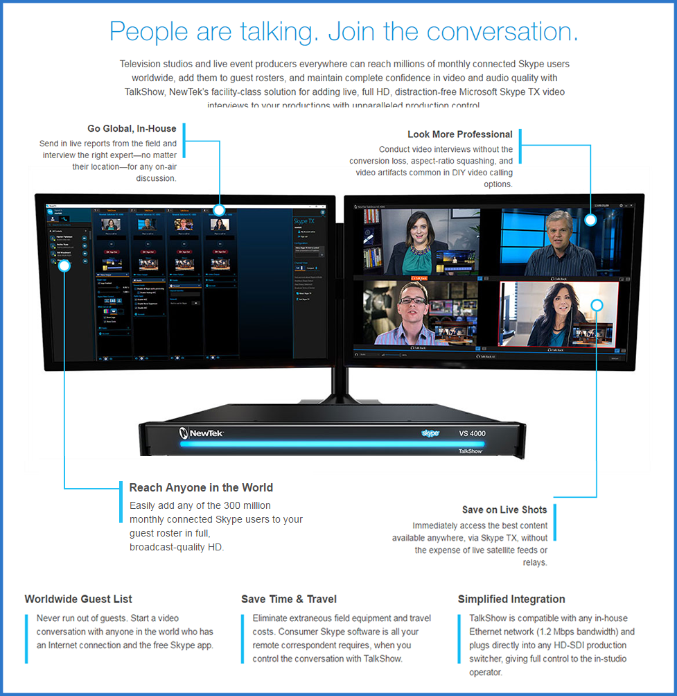 Television studios and live event producers everywhere can reach millions of monthly connected Skype users worldwide, add them to guest rosters, and maintain complete confidence in video and audio quality with TalkShow, NewTek’s facility-class solution for adding live, full HD, distraction-free Microsoft Skype TX video interviews to your productions with unparalleled production control.