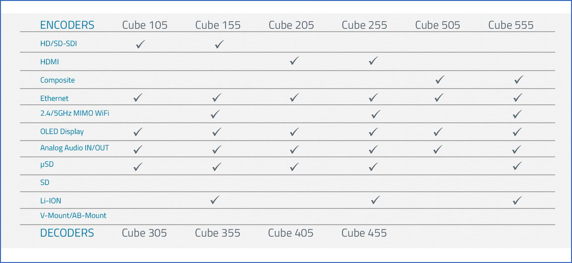 Teradek Cube Teradek Cube and Cube Pro encoders provide a powerful, compact wireless solution for local monitoring and proxy recording. Both devices utilize high profile H.264 compression and support resolutions up to 1080p over 2.4/5Ghz WiFi, Ethernet, and 3G/4G/LTE cellular networks via a USB modem.