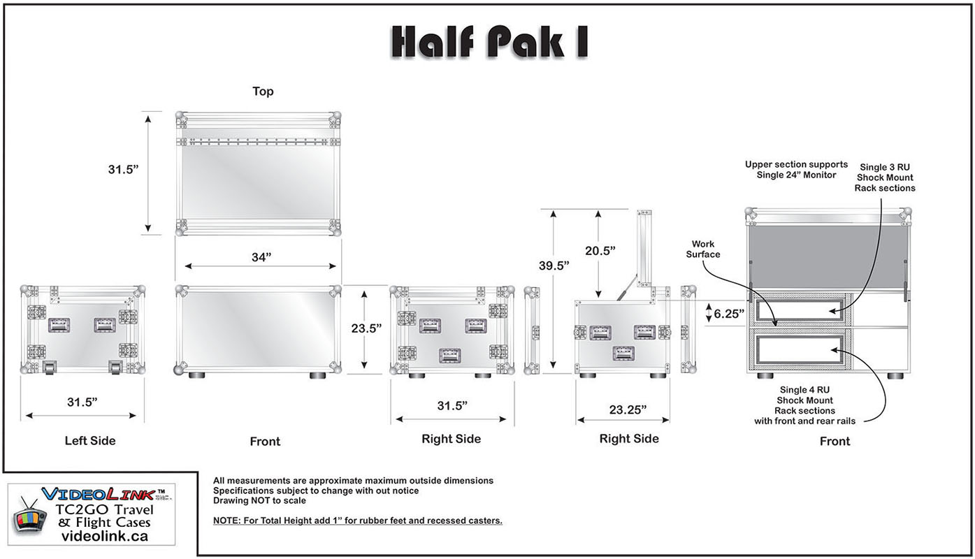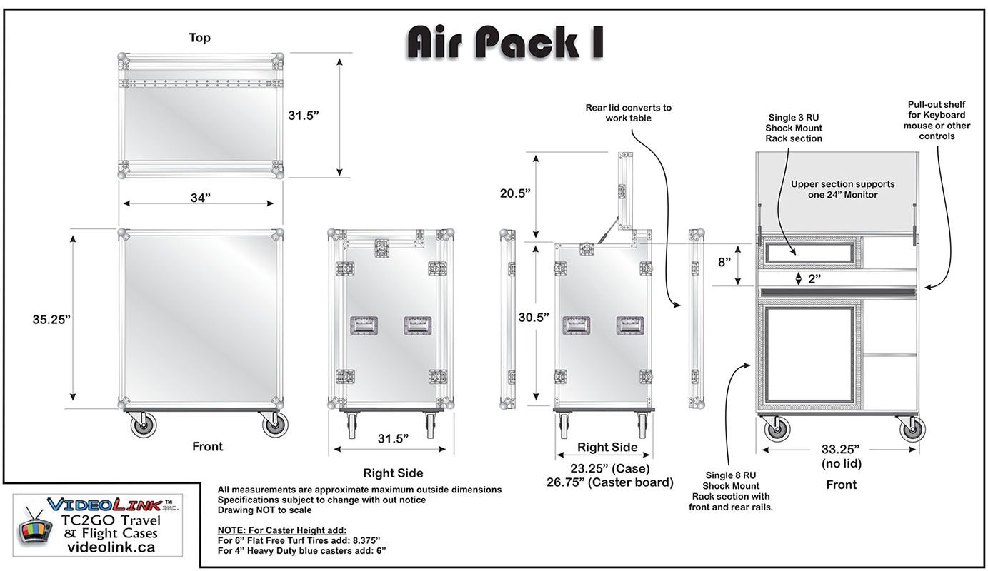 Open the doors, plug in power and internet, your cameras, and you are LIVE! Everything can be installed and pre-wired and runs right inside the box. This flight pack is designed to install everything you need for a live show. Complete access front and rear. Portability in a heavy-duty box with heavy density foam and heavy duty locking wheels. Very stable and secure. Storage compartment for keyboard, mouse, drives etc. Inset handles and heavy duty hardware. (monitors not included)