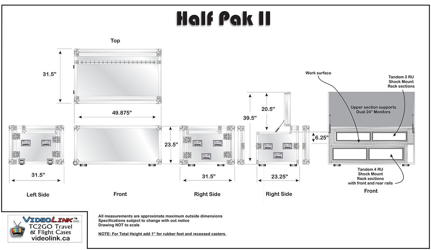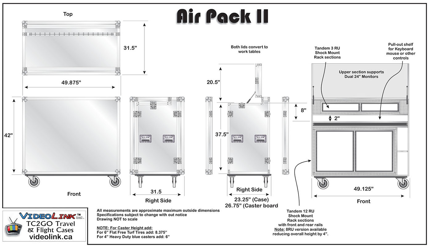 This rolling production desk will work with any 19" standard rack mount equipment. 2 X 8U or 10U or 12U (your choice) with 19" floating rack mount + storage ATA Rated, specially designed for professionals with locking neoprene wheels and heavy duty aluminum extrusions. Front and rear lids come off and double as tables, complete open access on both sides.
