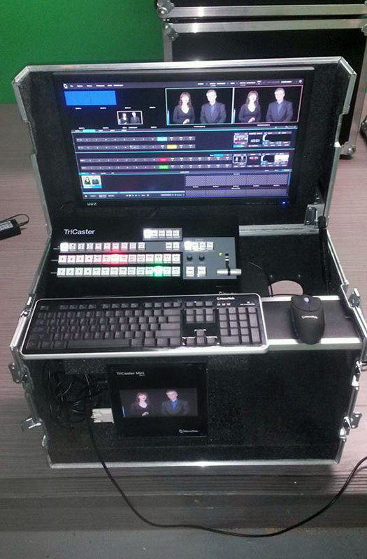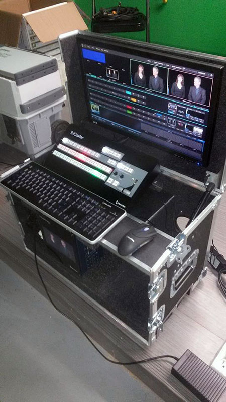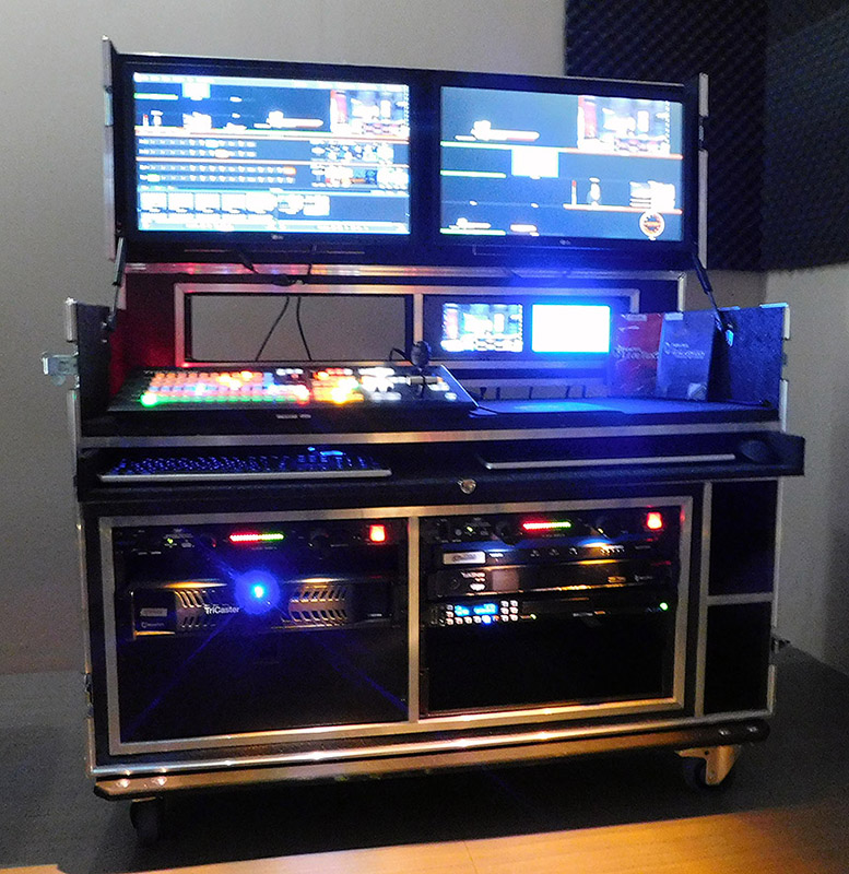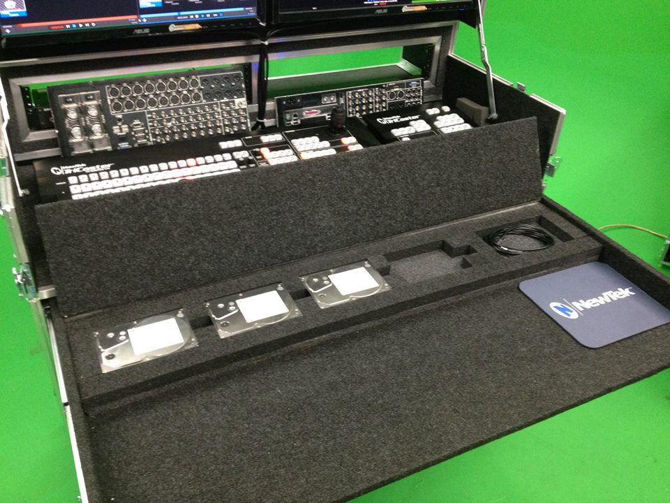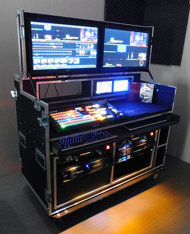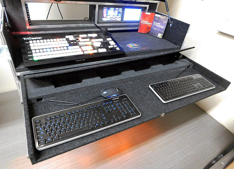 The upper deck includes an extra 3/4" rigid foam that you can cut out specifically for any control panel. Will house any broadcast switching system. Tricaster / Ross / Blackmagic / Datavideo / Livestream etc. Above the upper deck is 2 X 3U rack mount areas for intercom, digital recorders or other rack mounted production tools, beneath the upper deck is a slide out keyboard/mouse table with special hidden hard drive storage for transport. Flip up lid houses monitors on VESA mount up to 2 X 24" monitors. Extra storage compartment for cables/cameras, etc. Houses and protects your rack mount computers, monitors, drives, keyboard/mouse and other related rack mount hardware designed so you can set up with minimal time.