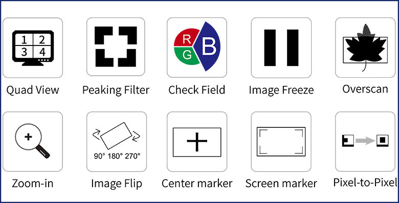 High Efficiency OSD Operation Design You can fast and direct switching signal, and F1-F4 user-definable buttons, witch can be customized as shortcut function,such as peaking, check field, display rotate, center marker, safe marker etc.